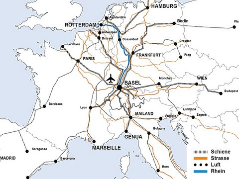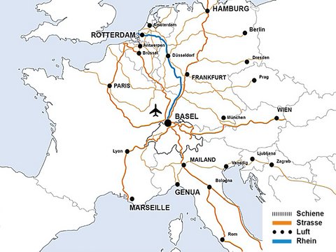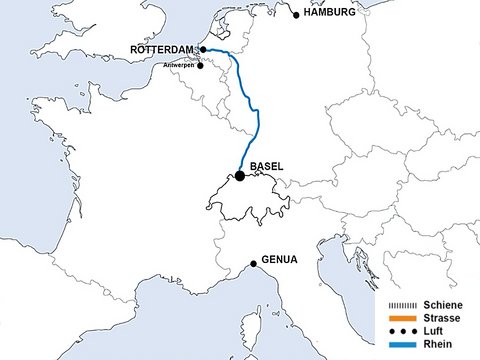 Basel ist die einzige Stadt der Schweiz mit direkter Anbindung ans Meer. Über den Rhein ist Basel direkt an die Nordsee bei Rotterdam angebunden. Über den Main-Donau-Kanal können Schiffe auch Ungarn und Südeuropa erreichen.